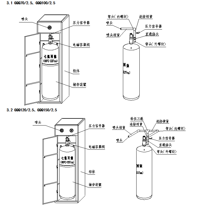 用于儲存七氟丙烷滅火劑,具有封存、釋放、充裝、超壓泄放、壓力顯示等功能。
