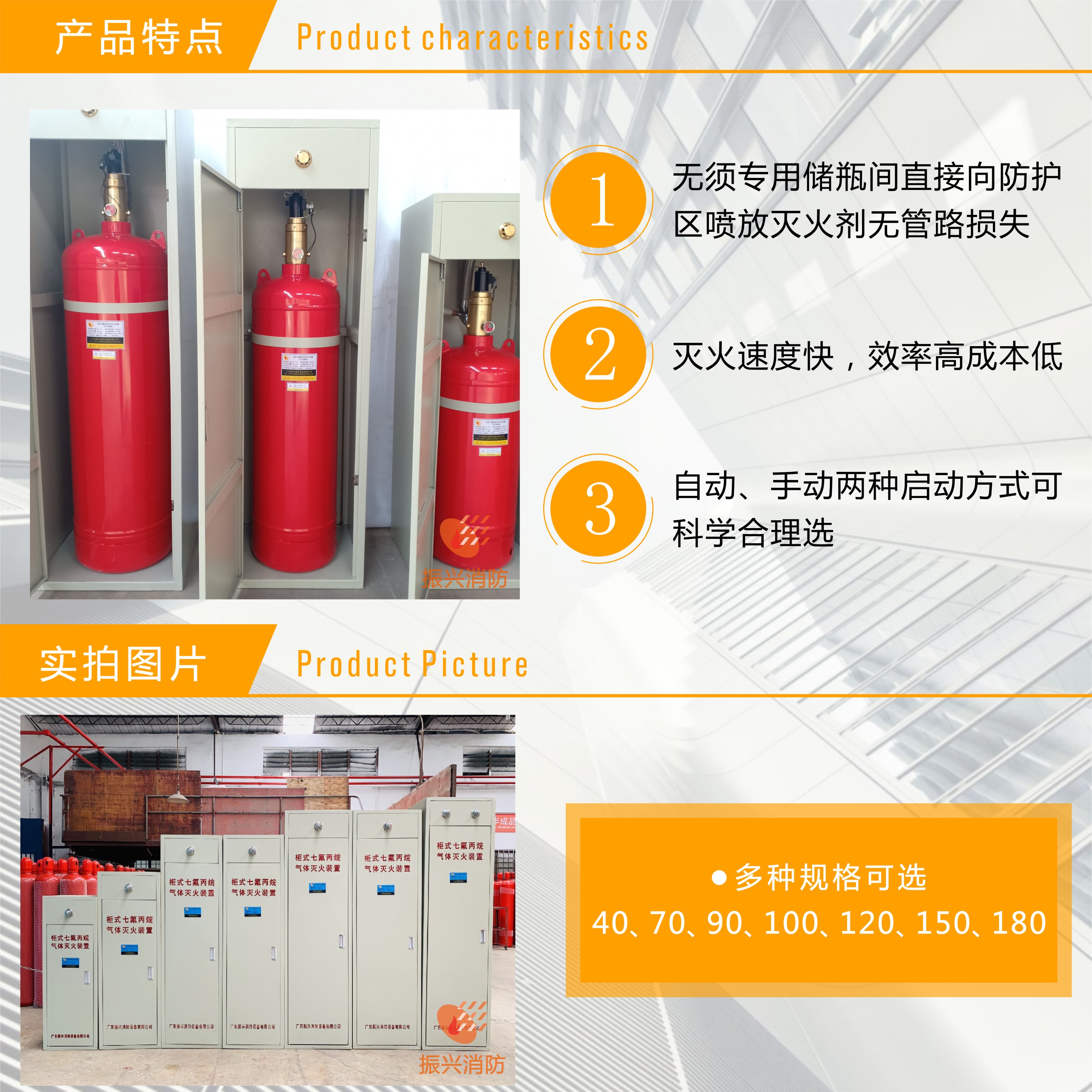 柜式滅火裝置以七氟丙烷(HFC-227ea)作為滅火劑。七氟丙烷以化學滅火為主,兼有物理滅火作用,無色、無味、清潔、不導電、不污染被保護對象,不會對財物和精密設施造成損壞,對大氣臭氧層無破壞作用(ODP值為零),符合環保要求,在大部分保護區域,滅火濃度均低于人體的無毒性反應濃度(NOAEL濃度),對人體是安全的,是一種優秀的潔凈氣體滅火劑。