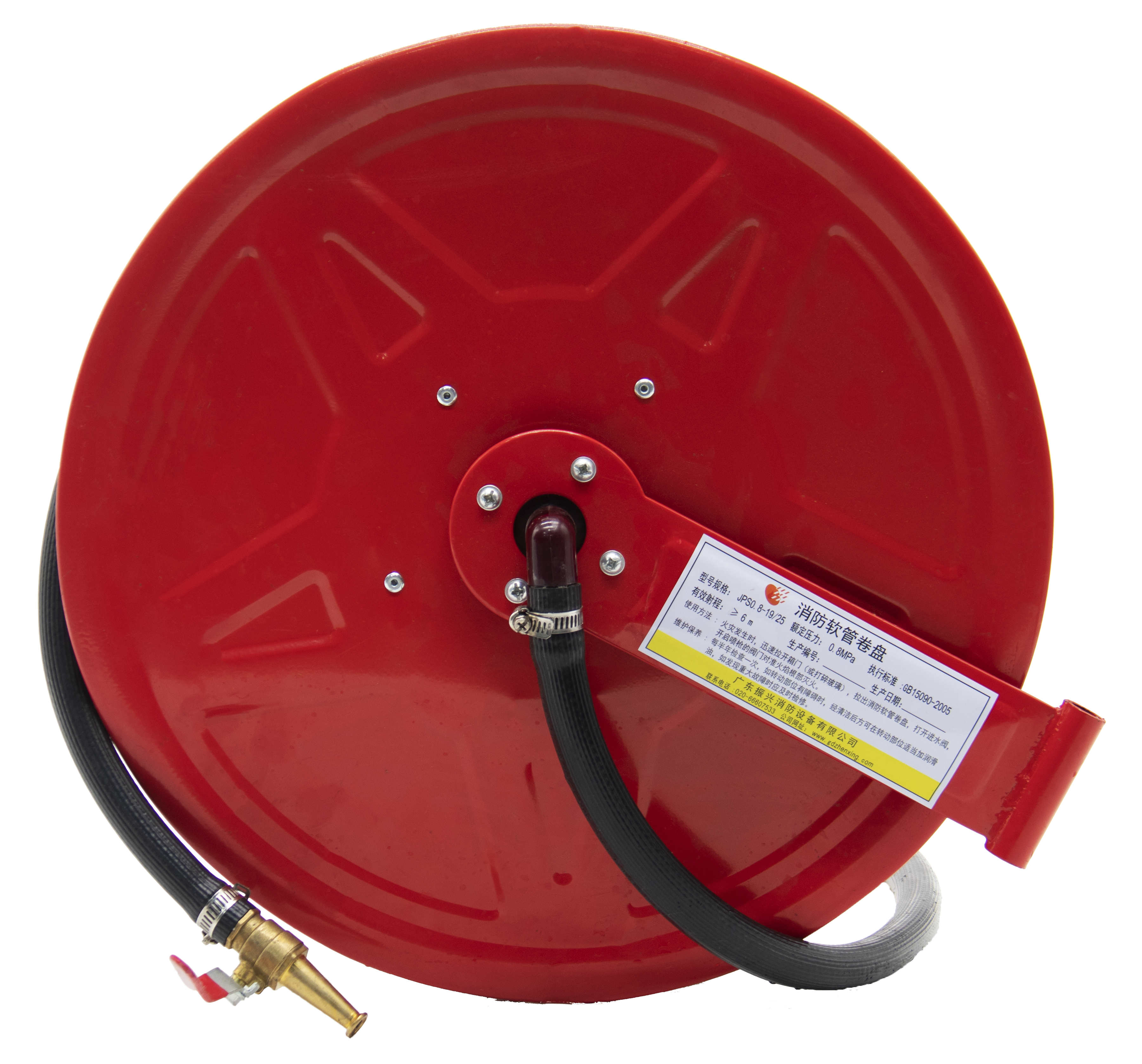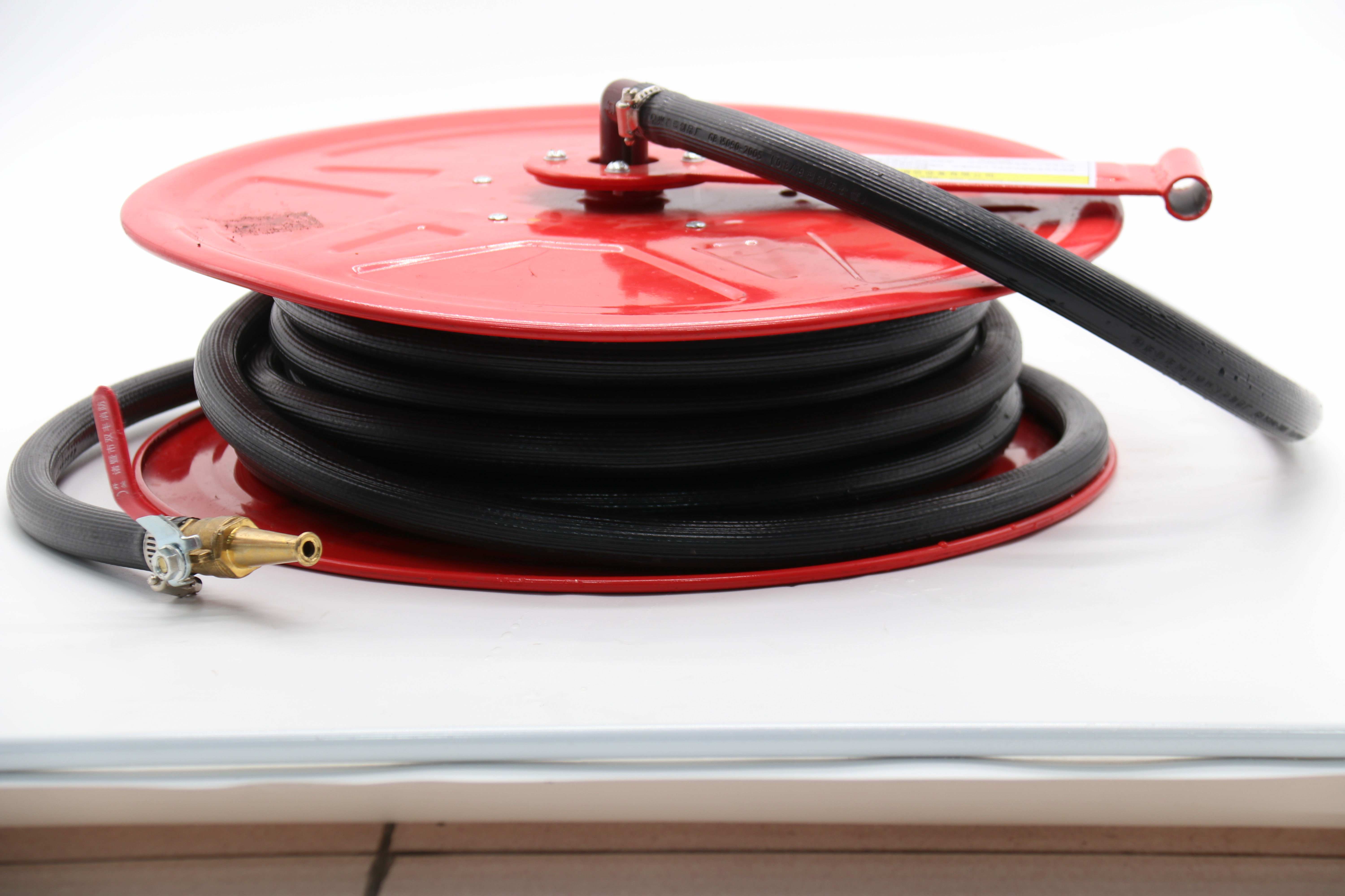 由閥門、輸入管路、輪輻、支承架、搖臂、軟管及噴槍等部件組成,以水作滅火劑,能在迅速展開軟管的過程中噴射滅火劑的滅火器具。一般安裝在室內消火栓箱內,是新型的室內固定消防裝置。 二、產品圖片: